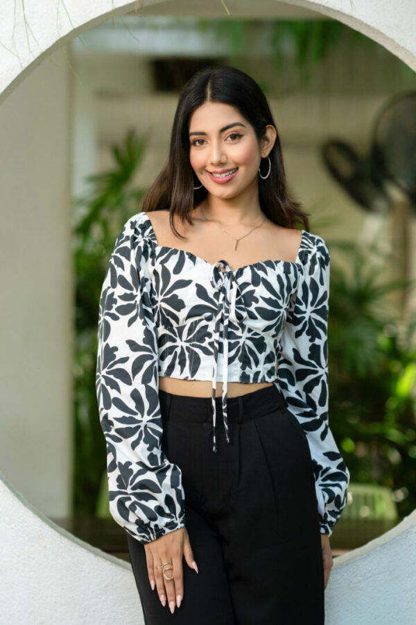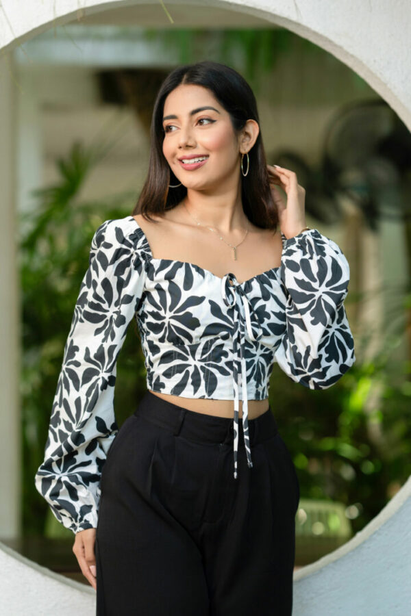 Unleash your inner fashionista with this effortlessly chic Crop Top. This top adds a playful yet polished vibe to your look. Featuring bold black abstract prints on a crisp white canvas, this top adds a playful yet polished vibe to your look. From gallery dates to rooftop hangs, it’s your new go to vibe.