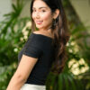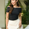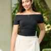 Elevate your style with this effortlessly chic look featuring a sleek off-shoulder black top can be paired with a statement maxi skirt, pants or a skort . Perfect for both casual outings and semi-formal occasions, this ensemble blends modern elegance with timeless sophistication.