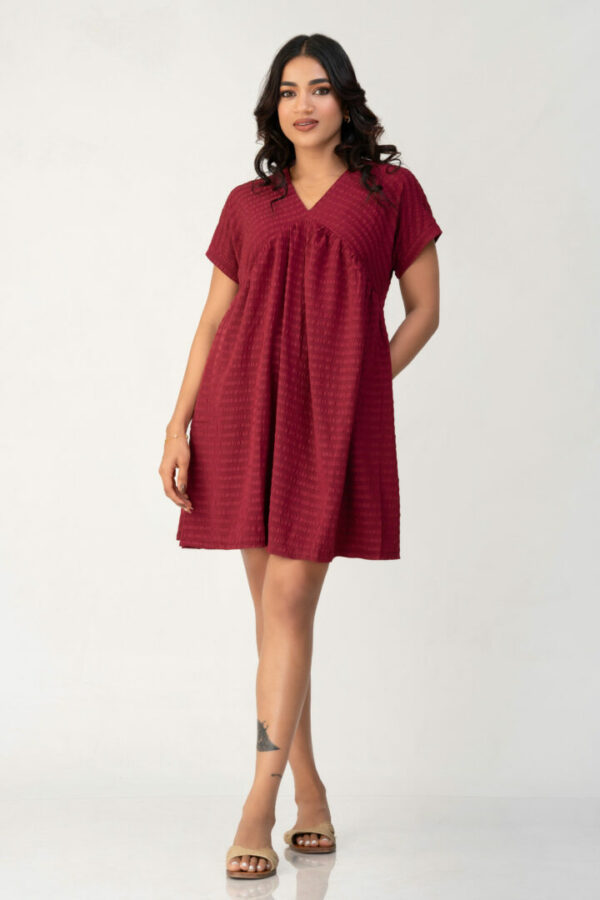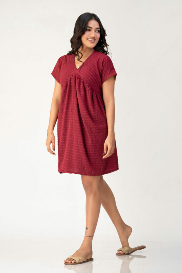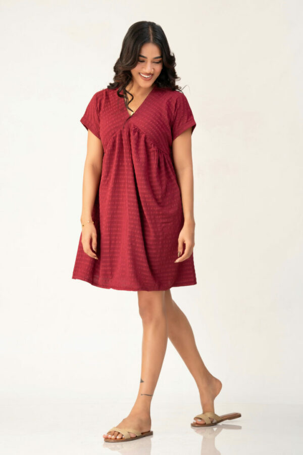 Meet the little red dress that’s equal parts cozy and chic! This breezy mini is made for days when you want effortless style with a touch of charm. The rich wine-red hue, soft textured fabric, and relaxed silhouette make it the perfect throw-on-and-look-amazing piece. With its flattering V-neck, fluttery sleeves, and gentle gathers that add movement, this dress is all about easy elegance — and yes, it comes with pockets for that everyday magic!